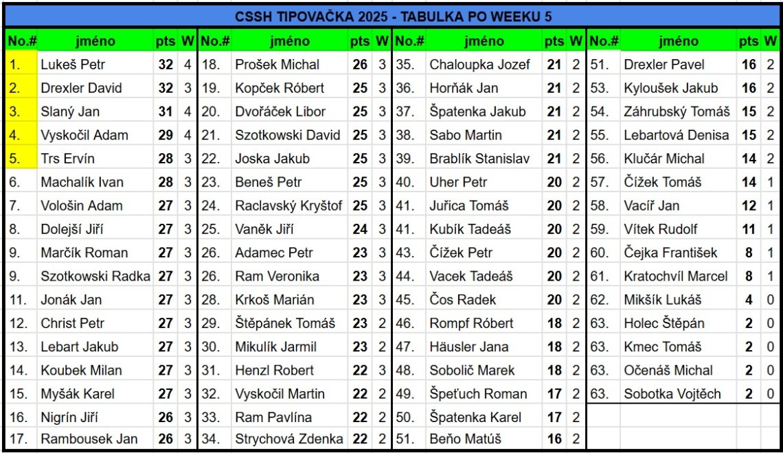CSSH TIPOVAČKA 2025 – TABULKA PO WEEKU 5