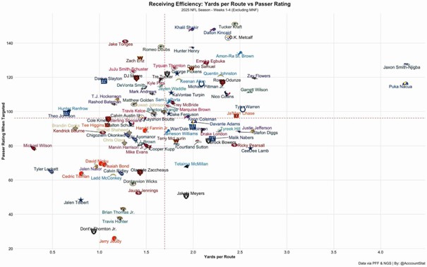 7. Jaxon Smith-Njigba (na úvodní fotce) je mezi wide receivery se 402 zachycenými yardy na druhém místě. Vede Puka Nacua s 503 yardy.