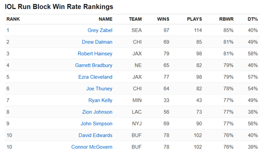 12. Gray Zabel vede statistiku Run Block Win Rate mezi interior offensive linemany, tedy na pozicích guard a center.