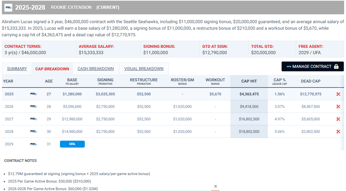 Oficiálně prodloužil o dva roky za $75M, avšak se jedná o kontrakt na roky 2026 a 2027. Ze Seattlu si odnesl svou aktuálně platnou smlouvu, v rámci níž letos obdrží $40M a v příštím roce dalších $26,5M. Tyto peníze má fakticky plně garantované a za určitých okolností by Raiders z výše uvedené částky mohli ušetřit maximálně kolem $8M. Teprve v sezoně 2027 by měl vydělat $39,5M. Avšak známe, jak to v NFL chodí, a tak rok 2027, kdy Genovi bude 37 let, je už klasicky ke zvážení. Svatá trojice před začátkem poslední sezony: cut – trade – extension… Genův kontrakt je tak společně s letošním rokem 2025 celkem na 106 milionů s tím, že první dvě sezony má s průměrným výdělkem skoro $33M garantovány.