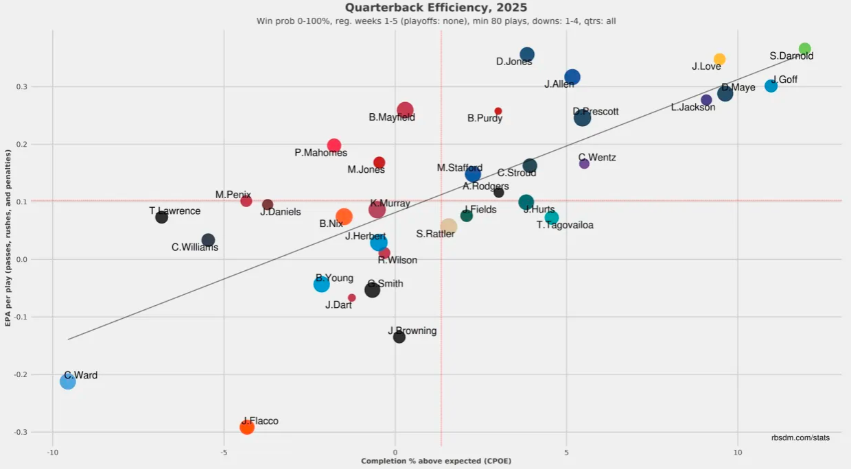 Sam Darnold má 9 přihrávek pro touchdown. Geno Smith má 9 přihrávek pro interception. Obrázek zachycuje quarterbacky NFL od prvního do pátého kola. Jasně, pořád je to jenom pět týdnů, ale vyměnit Gena Smitha do Las Vegas Raiders a současně získat z free agency Sama Darnolda, se zatím ukazuje jako dobrý počin.
