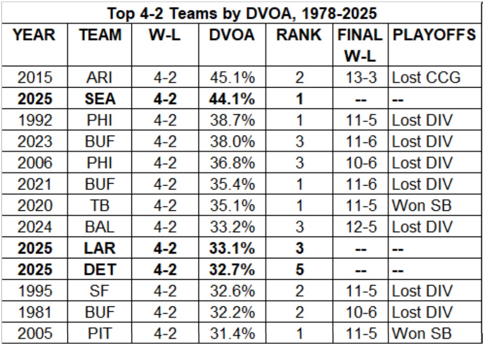 Z prvního místa sesadili Detroit Lions a v této “Defense-adjusted Value Over Average“ metrice vykazují hodnotu 44,1 %, přičemž pouze jediný tým měl od roku 1978 vyšší DVOA, když byl současně na bilanci čtyř výher a dvou porážek. Šlo o Arizonu Cardinals v sezoně 2015. V tabulce níže je možné si všimnout, že mezi top-10 v letech 1978 a 2025 se nachází hned trojice týmů z letošní sezony, a kromě nás jsou jimi Rams (33,1 %, celkově na 3. místě) a Lions (32,7 %, celkově na 5. místě). Údaje jsou vedeny k pondělnímu ránu a teoreticky do toho mohl promluvit Washington, který měl po pěti týdnech 31,6 %. NFC začíná být pořádně našlapaná a samotný rekord o Seahawks, ale také o Lions, Rams či Commanders rozhodně neříká vše.
