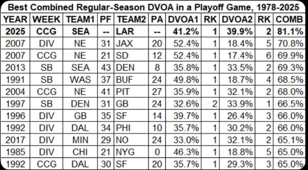 Tabulka níže zachycuje přehled dvanácti utkání s nejvyšším součtem DVOA, který najdete v posledním sloupci. Seahawks zakončili sezonu s DVOA 41,2 %, Rams pak s 39,9 %. Tento souboj je tedy o více než 10 % výše než utkání divizního play-off ze sezony 2007, které ale jde na vrub vysokým hodnotám tehdy v základní části neporažených New England Patriots.
