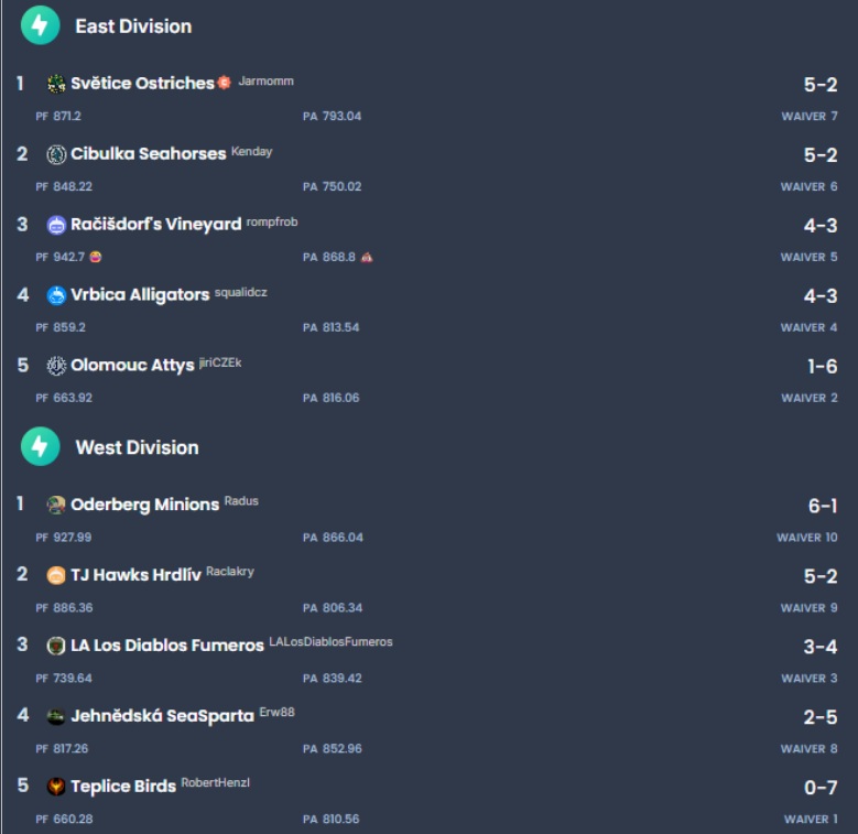 Na Západě, a celé lize, dominují s rekordem 6-1 Minions, kteří skutečně vypadají jako silný tým, který si zaslouží svůj výsledek, místo aby spoléhal na štěstí. V těsném závěsu se s rekordem 5-2 drží TJ Hawks, kteří jsou stabilní a zaslouženě se pohybují v popředí. Ostatní týmy divize West už mají negativní rekord. Diablos Fumeros (3-4) a SeaSparta (2-5) jsou nešťastnými případy týmů, které sice hodně bodů sbírají, ale jejichž soupeři zároveň skórují ještě víc. Poslední v divizi zatím zůstávají winless Birds, kteří si zároveň s počtem 660,28 o fous nesou nelichotivé prvenství v podobě nejméně získaných bodů. Do playoff tedy zatím jdou Minions a TJ Hawks, do Toilet Bowlu Birds.