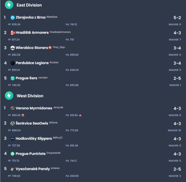 Shrnuto, do zbytku sezóny vstupujeme s několika top favority, kterými jsou na základě skvělého PF a PF-PA rozdílu Myrmidones, Zbrojovka a SeaOwls. Pozornost si zaslouží Stoners, kteří jsou navzdory aktuální bilanci největším „podvodníkem“ ligy a mají obrovský potenciál pro zlepšení. Naopak týmy, které se drží v popředí se špatným PF (Puntriots a Slippers), budou muset najít skryté rezervy nebo se smířit s koncem ročníku po závěrečném regular season weeku 15. Playoff místa, zejména v Západní divizi, každopádně zůstávají naprosto otevřená a boj o ně bude velmi intenzivní.