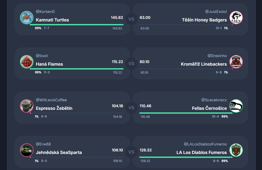 Byl to docela quest, vyhrát letos divizi West. Nakonec se to s pouhými šesti výhrami povedlo Linebackers, kteří však roli outsidera nedokázali přetavit ve svůj první playoff win a stejně jako loni končí ve čtvrtfinále. Mezi nejlepší čtyřku naopak hned ve své první sezóně postupují Flames, kteří v něm budou hájit jeden ze dvou moravských semifinálových praporů. Rozdíl přesahující 35 bodů byl způsoben zejména poměrem 4-1 na hráče s 15+ body, z nichž vyčuhovala dvojice WR Jameson Williams a QB Josh Allen dohromady se ziskem 50.92 fpts.