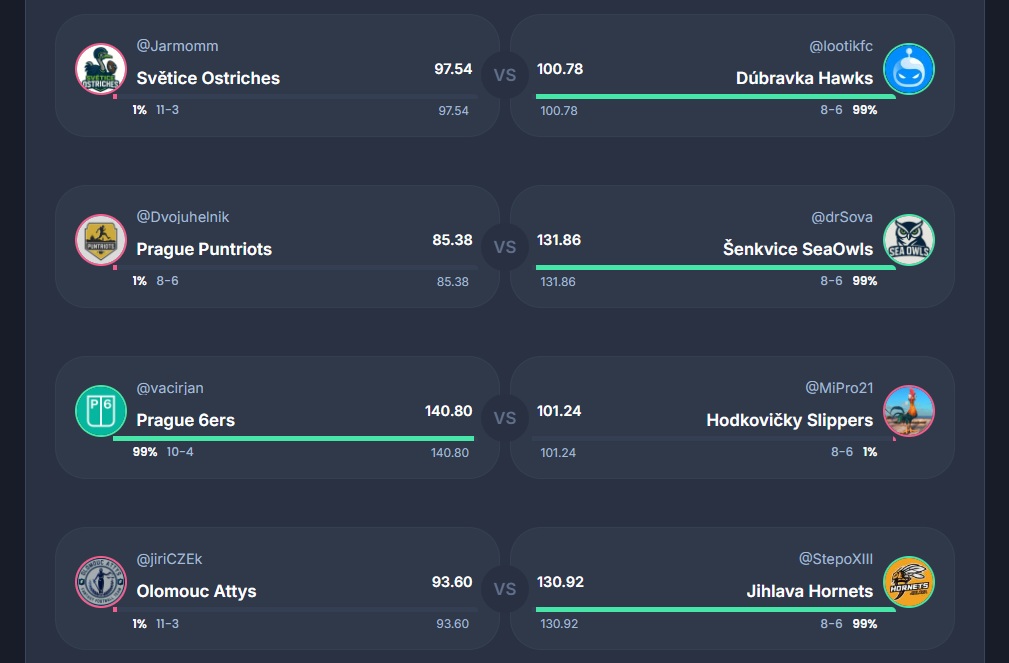 Když se Ostriches dostali do playoff poprvé, psal se rok 2022 a oni do něj na poslední chvíli proklouzli jen tak tak z osmého místa. Také tehdy skórovali ani ne 47 bodů a dostali dost nepřekvapivou nakládačku od pozdějších účastníků FSB IV, dnes již neexistující Ostravy Seahawks. Tentokrát to byla jiná pohádka, když sice skórovali hned o 50 bodů víc, než při své první a až dosud i poslední postseason účasti, ale ani tak to v nejtěsnějším čtvrtfinálovém zápase napříč oběma ligami nestačilo na dvojnásobné ligové šampiony z Dúbravky, kteří tak po 41bodovém výprasku z weeku 11 porazili, seč mnohem těsněji, Ostriches i podruhé. Hawks napříč faktu, že si těsně před nedělním kickoffem nezkontrolovali, že jeden z jejich starting RB je out, zvítězili i v osmi lidech o pouhé 3.24 fpts a s tituly z let 2019 a 2022 jsou tak dva krůčky od toho, aby opět po třech letech porazili úplně všechny. Pro Dúbravku se tak se štěstím jedná již o osmé playoff W a jedná se v tomto ohledu o historicky zdaleka nejúspěšnější franchise historie CSSH Fantasy.