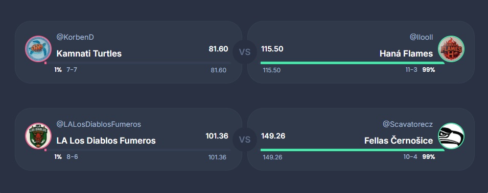 Flames sice do kolotoče CSSH Fantasy vstoupili jako rookies teprve letos, ale ani to jim nezabránilo sežehnout všechny, kteří se jim postavili do cesty a postoupit nejen do druholigového finále, ale s tím také hned i do první ligy pro sezónu 2026. Hlavním rozhodujícím faktorem byl poměr hráčů s více než 12 fpts celkem 3-1 v jejich prospěch, a tak to bylo zejména duo WRs Zay Flowers a DJ Moore doplněné o nejlepšího hráče týmu RB Jaylena Warrena se season-best 29.10 body, kdo o postupu Hané rozhodl. Turtles si naopak svou šanci na postup promrhali úplně sami. Ve starting rosteru totiž nechali hned dva hráče, kteří v tomto týdnu nehráli a i když kombinací správného prohození vlastních hráčů, nákupu ve free agency a kapky štěstí mohli Flames dokonce porazit, Turtles si na svůj velký návrat mezi elitu budou muset ještě alespoň rok počkat, neboť také v příštím roce budou jedněmi z účastníků druhé ligy, v níž hrají už od roku 2023.