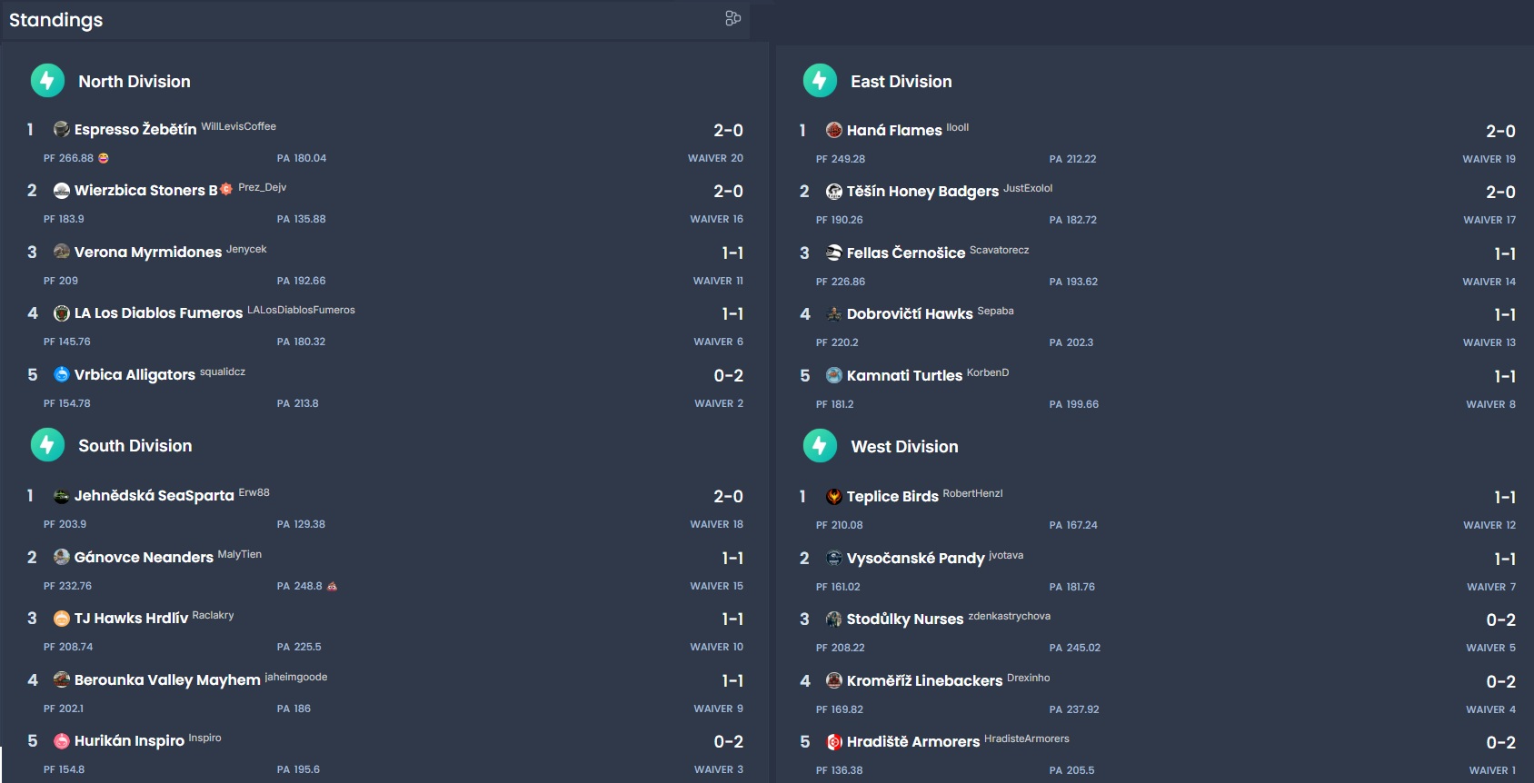 Rookie tým Haná Flames a dosavadní ligový otloukánek Espresso Žebětín, který se ale očividně nadechuje k breakout season, si pouze prohodili svá místa a zatímco tým z Prostějova nově zaujímá #2 seed, brněnské mužstvo se rázem ocitá na dosud nepoznané pozici – na samém vrcholu tabulky. Jehnědská SeaSparta, která si, trochou trashtalkem řečeno, snad v říjnu nevypotřebuje povolený počet free agency moves, si stále zkušeně drží #3 spot a v zatím očividně nejslabší West Division, který má zatím total record jen 2-8, přebírají vedení a celkově čtvrté místo tabulky Birds z Teplic. Samozřejmě teprve začínáme, takže se ještě může stát prakticky cokoliv…