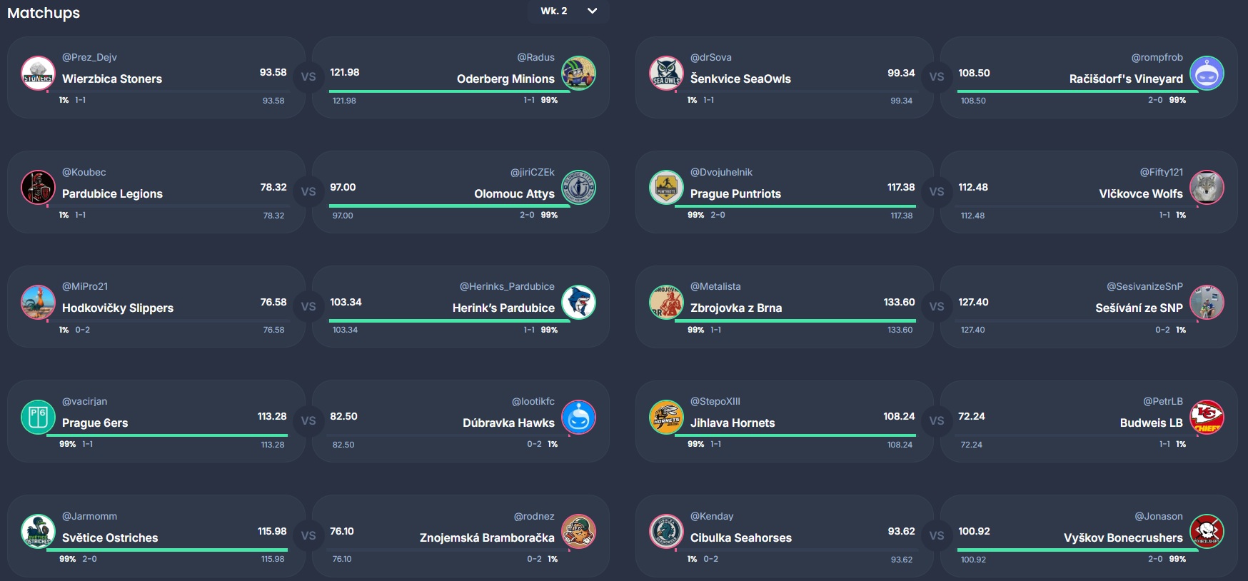 What a match! Puntriots i Wolfs po úvodní výhře vstupovali do divizního matchupu s oprávněně dobrým pocitem, že toho druhého mohou porazit, ale dopředu bylo jasné, že jednomu z nich se to nepodaří. A byl to nakonec celek z Prahy, který v nejtěsnějším matchupu druhého hracího týdne o pouhých 5.90 fpts urval W a posunul se tak na #1 seed celé ligy. Prvoligoví nováčci z Vlčkovců se tedy v North Division se drží na třetí příčce a musí se smířit s první prohrou mezi elitou.
