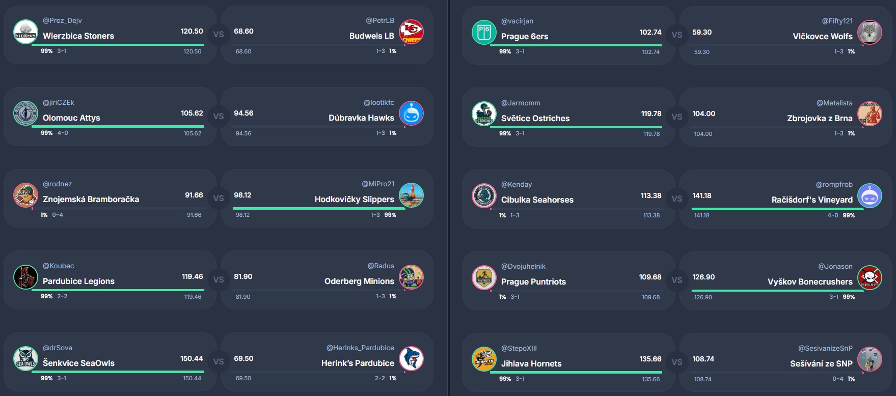 Debakl tohoto kola lze tentokrát bez velké nadsázky nazvat spíš masakrem týdne. Na Východě vedoucí SeaOwls suverénně vletěli do Pardubic, vyplenili vše, co se jen dalo a na cestu domů si vezou sedmdesátibodový skalp, jenž si od nich tým Herink’s vysloužil. Důvody jsou nasnadě. Třetí nejlepší hráč kola WR George Pickens s 33.40 body a rozdíl 4-0 na hráče s 20+ fpts u Šenkvic nebo naopak prekérní QB situace v Pardubicích, kde se zranil Joe Burrow a Tyrod Taylor byl už zase vystřídán za Justina Fieldse. Nabídnu trade Browninga?
