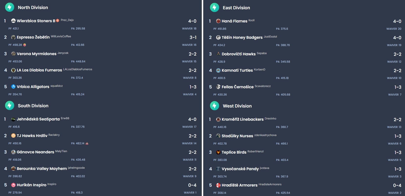 Dva divizní lídři se mění, jeden zůstává a jede jde dokonce do breaku. Plus k tomu třešnička na dortu v podobě tří zápasů rozhodnutých menším než čtyřbodovým rozdílem. Asi tak by se ve stručnosti dalo shrnout dění čtvrtého hracího týdne v naší druhé dvacítce. Na průběžné první místo se posouvá Haná Flames, která vládne v East Division. Hned za nimi je však nahánějí divizní rivalové a další rookies Těšín Honey Badgers. Týmy z Prostějova a Českého Těšína se tak nyní jako jediné ze čtyř desítek týmů mohou chlubit tím, že ještě nikdy neprohrály. Druhý seed přebírá můj defaultní tým Wierzbica Stoners B, který “pouze udržuju naživu” a do konečného pořadí se nepočítá. Ten v North Division přebral vedení od letos výborně hrajícího Espressa Žebětín, které v utkání neporažených podlehlo Těšínu o necelé 4 fpts. Třetí místo a nic jiného – to je zatím letošní průběžné umístění týmu Jehnědská SeaSparta, která se v divizi na Jihu dostává do brzkého dvouzápasového trháku před trojici svých nejbližších pronásledovatelů. Posledním divizním lídrem je pak Kroměříž Linebackers, která nově přebírá žezlo v (not so much Wild) West Division, jež zatím hostuje souboj paraplegiků proti hluchoněmým s nemocí motýlích křídel, když její celkový record po měsíci hry činí smutně vyhlížejících 5-15.