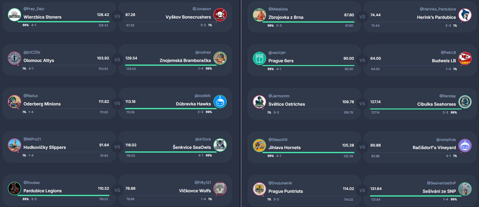 Sejdou se oba týmy na recordu 2-3 nebo je bude dělit prakticky polovina tabulky? To byla původně stěžejní otázka tohoto souboje, která ale pozbyla svůj smysl už před jeho začátkem. Wolfs totiž vůbec nenastavili sestavu, dostali výprask skoro o 34 bodů a pět týdnů po postupu do první ligy, na kterém se ve Vlčkovcích tři roky dřelo, jsou tak se strikem, recordem 1-4 i s nejhoršími 72.2 fpts/game na posledním místě. Legions sice měli pouze dva hráče s 12+ body, ale zbytek týmu, naštěstí pro ně, táhl naprosto příkladně za jeden provaz.