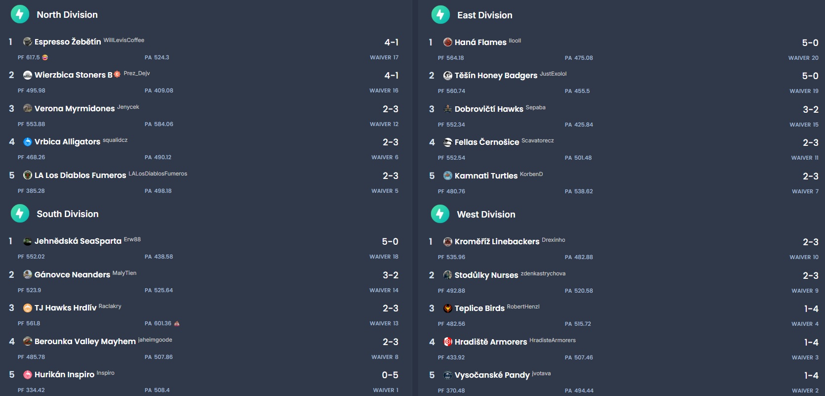 Flames si připsali již třetí poměrně těsnou výhru o 13 a méně bodů, ale W je W, první místo je furt první místo a být po celých pět týdnů maximálně na #2 seedu, tak to je tedy panečku zatím jednoznačná dominance rookies z Hané. Také druhá Jehnědská SeaSparta je zatím neporažená, od season kickoffu vede svou divizi a dokonce si v ní drží dvouzápasový náskok. Na celkové třetí místo a zároveň zpět do vedení North Division skáče suverénně nejvíc skórující tým druhé ligy Espresso Žebětín. No a už teď se zdá, že čtvrté místo tady letos nejspíš bude vyhrazeno pro vítěze Západu, který se zatím s celkovým recordem 7-18 potácí v úplně jiném závodě, než všichni ostatní. Vedení v této “třetí lize” zatím s recordem 2-3 hájí Linebackers, kteří by, kdyby byla tabulka společná pro celou ligu, figurovali až na celkovém devátém místě. Takto jsou ale díky vedení ve West Division čtvrtí, a to třeba ještě před 5-0 Těšínem Honey Badgers nebo 4-1 Wierzbicou Stoners B.