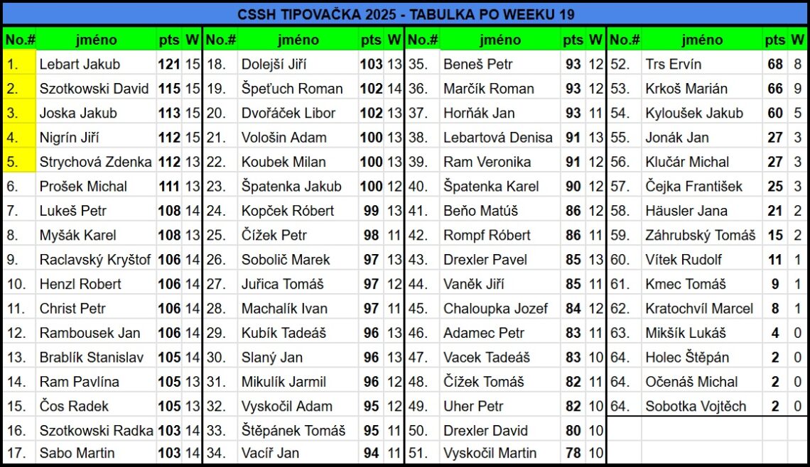 CSSH TIPOVAČKA 2025 – TABULKA PO WEEKU 19