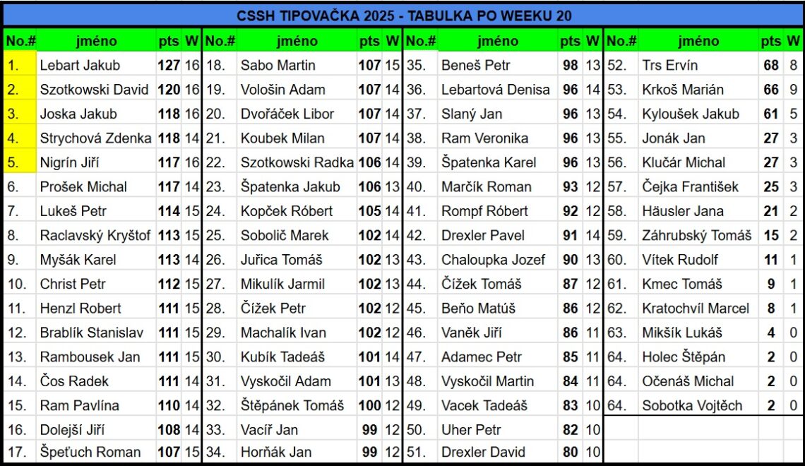 CSSH TIPOVAČKA 2025 – TABULKA PO WEEKU 20