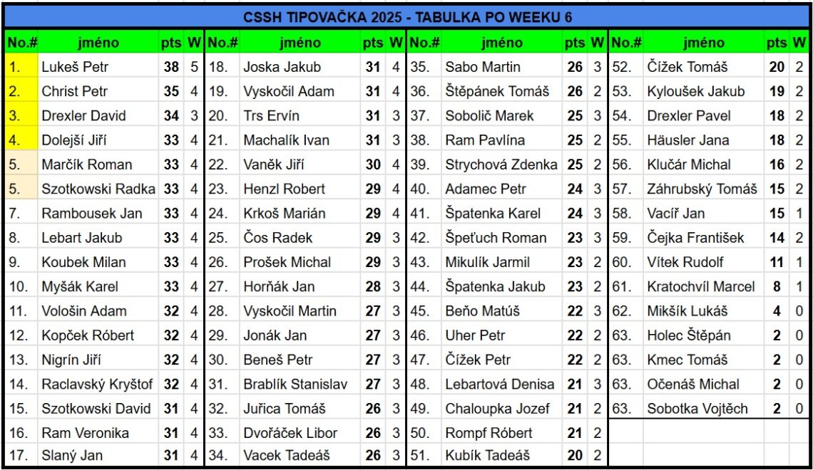 CSSH TIPOVAČKA 2025 – TABULKA PO WEEKU 6