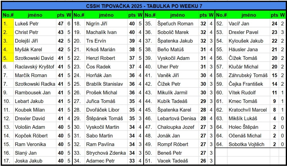 CSSH TIPOVAČKA 2025 – TABULKA PO WEEKU 7