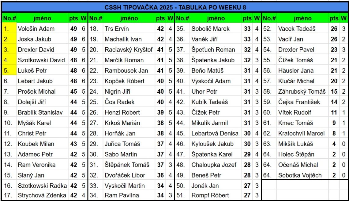 CSSH TIPOVAČKA 2025 – TABULKA PO WEEKU 8