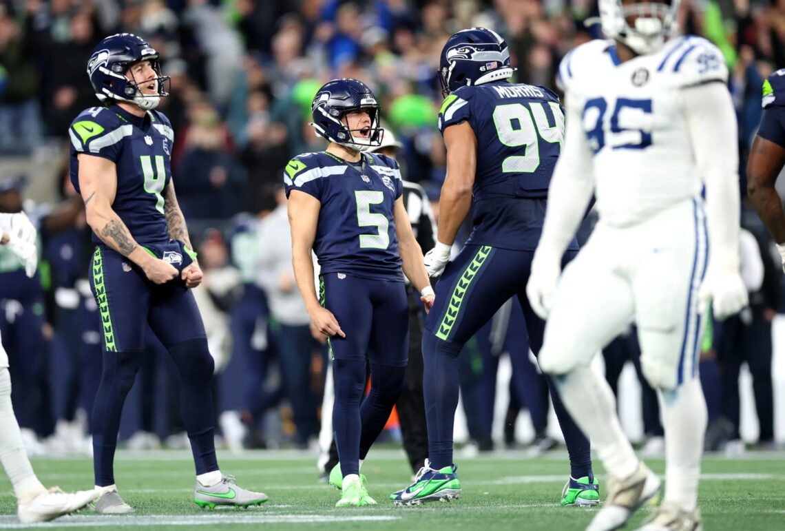 Jednoznačným hrdinou utkání, který by si, jak jsem již napsal, zasloužil nominaci minimálně na prezidenta vesmíru s výsadními intergalaktickými právy, se však bez jakýchkoliv debat stal kicker Jason Myers (na fotce uprostřed). Ten postupně proměnil field goaly ze vzdálenosti 47, 52, 46, 32 a 30 yardů a navzdory druhému pomalému rozjezdu ve dvou týdnech jsme se tentokrát čistě díky němu dostali dvě a půl minuty před koncem zápasu vůbec poprvé do vedení. Útok Colts však v tu dobu ještě neřekl své poslední slovo a tak se jejich kicker Blake Grupe dostal k 60-yd pokusu o FG, který proměnil a vylepšil si tak svůj osobní rekord. Za nepříznivého stavu 15-16 však Seahawks řekli ,,hold my beer” a díky returnu a dvěma zachyceným passům Rashida Shaheeda se následně s osmnácti vteřinami na gameclocku dostali až do pozice, odkud měl Myers opět možnost překlopit skóre na naši stranu. J-My, Mr. Automatic 2.0, Money J nebo chcete-li Australský Bůh, se postavil před 56-yd field goal. Chris Stoll snap, Michael Dickson hold, Jason Myers kick and the kick is GOOOOOD! Offense Indianapolis se pak už zmohla pouze na to, aby za přispění Spoonovy výstavní teče našla náruč Cobyho Bryanta, jehož interception tak definitivně uzavřela stav na konečných 18-16 v náš prospěch a oslavy mohly začít. Myers včera trefil 6/6 FG, stál za všemi našimi osmnácti body a s celkovým ziskem 153 bodů pak nejenže ustanovil své nové franchise single-season career-high numero, ale už jen pouhých 16 bodů mu chybí překonání týmového maxima running backa Shauna Alexandera ze sezóny 2005 a 33 bodů pak k pokoření dokonce NFL all-time recordu RB LaDaniana Tomlinsona, který jej ustanovil o rok později. To vše Myers reálně atakuje jako kicker! Nebylo tedy divu, že tradiční pozápasový game ball z rukou coache Macdonalda si v kabině vysloužil právě on. A výčtem úspěchů tohoto listopadového NFC Special Teams Player of the Month a pravděpodobného NFC Special Teams Player of the Week 15 ještě nekončíme, neboť jeho závěrečná 56-yd trefa byla nejdelším game-winning field goalem v posledních dvou minutách zápasu v historii Seahawks a rovněž šest úspěšně proměněných field goalů v jednom zápase je nový franchise-record. Osmý game-winning field goal jeho kariéry tak bude v Myersově životopisu zapsán zlatým písmem. Seattle si pak díky jeho neomylné noze připsal teprve čtvrtou výhru ve své historii, k níž nepotřeboval skórovat ani jeden touchdown. Pro porovnání pak už jen na závěr doplním, že ani v jednom z předchozí trojice těchto případů jsme v utkání nedali víc než tři field goaly. What a day, J-My!