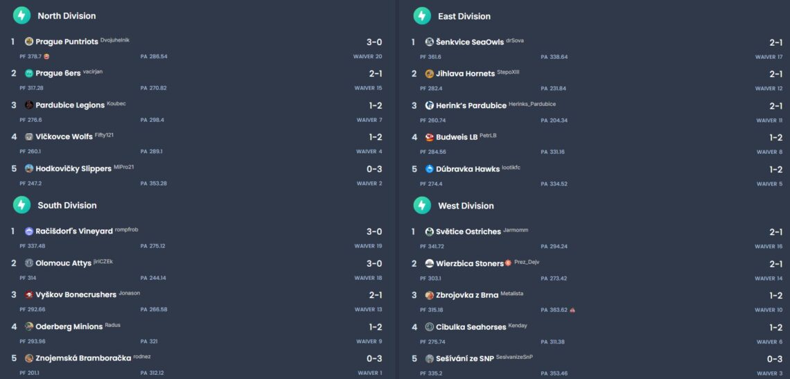 Ačkoliv za sebou v soutěži máme teprve nějakou pětinu letošní regular season, jméno ani jednoho z divizních lídrů se nám mezitýdenně nezměnilo. No a i když je to nyní s recordem 3-0 do playoff rozhodně blíž, ani při stavu 0-3 na svém kontě do toho bezpochyby nemá cenu házet vidle. Do konce je daleko. Wierzbica Stoners (#7, 2-1) vs. Vlčkovce Wolfs (#17, 1-2)final: 88.30 – 63.76 Neexistuje lepšího pocitu pro GM, než když u úterní ranní kávy chválí své nastoupené svěřence za to, že se dostali zpět na winning-record a pozice vedoucí do postseason. I když tentokrát to tedy žádná sláva nebyla… Dost bídný výkon zbytku týmu a ušmudlané W…