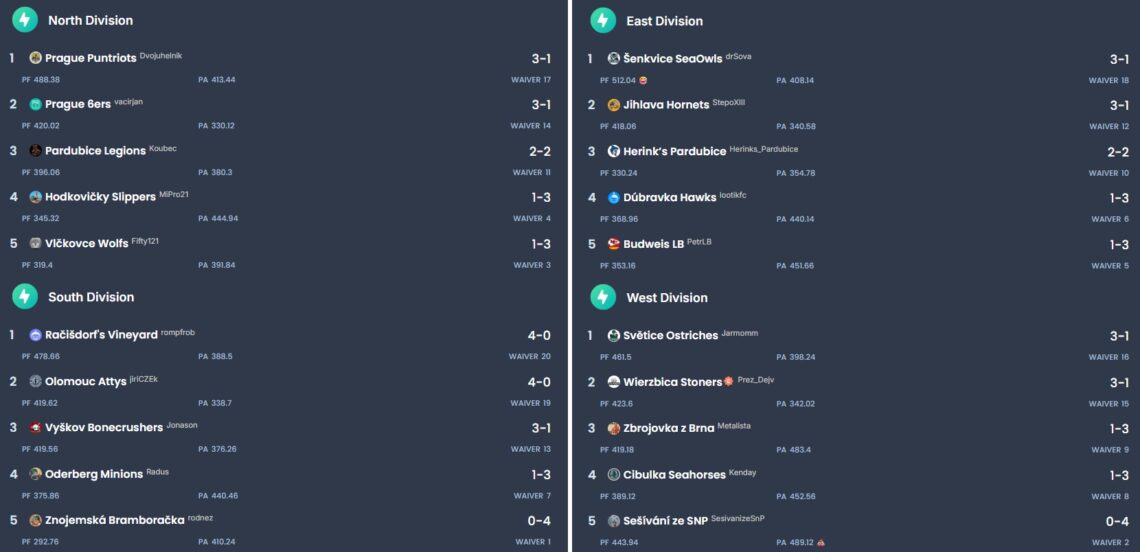 Krásně se nám to rozjíždí. Týmy od Plzně na západě po Gánovce na východě, respektive od Budějovic na jihu až po Teplice na severu rozjeli nekompromisní závod s cílem ve Fantasy Super Bowlu VII! Někdo si s 4-0 píská, někdo je s recordem 3-1 optimistický, jiné 2-2 týmy tak nějak proplouvají, 1-3 mančafty doufají, že bude znatelně lépe a ti s recordem 0-4 už pomalu vyhlížejí ve schránce pozvánku k Draftu 2026. Nebo je to jinak? Jak se daří u našich GMs v kanclu a jaké jsou pro letošek cíle Vašich vlastních svěřenců? Přečtěte si článek a rozhodně dejte vědět v komentech. Wierzbica Stoners (#6, 3-1) vs. Budweis LB (#16,…