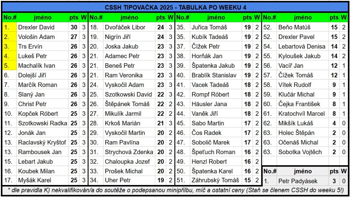 CSSH TIPOVAČKA 2025 – TABULKA PO WEEKU 4