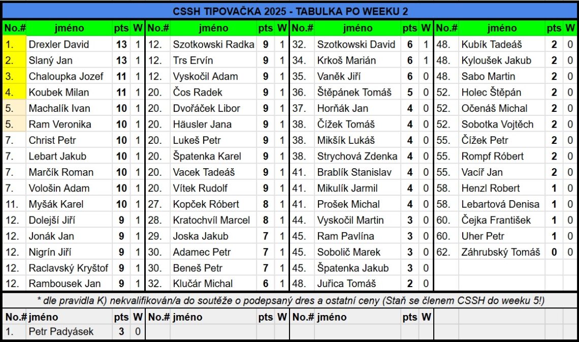 CSSH TIPOVAČKA 2025 – TABULKA PO WEEKU 2