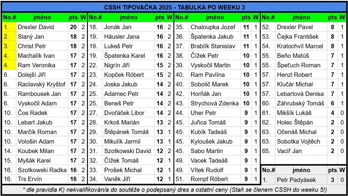 CSSH TIPOVAČKA 2025 – TABULKA PO WEEKU 3