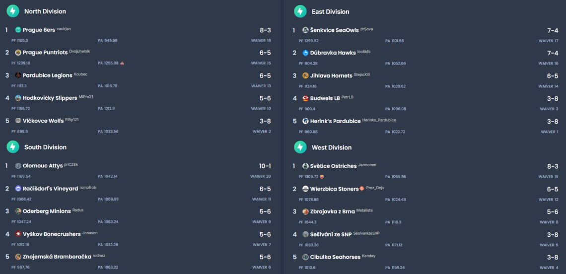 Divizní lídři se od weeku 7 nemění, ale příběhů naše liga takto před závěrečnou fází bojů o playoff spoty rozhdodně nabízí víc než dost… Wierzbica Stoners (#9, 6-5) vs. Znojemská Bramboračka (#15, 5-6)final: 96.34 – 108.92Není to zas tak dávno, kdy nálada u Stoners byla o poznání veselejší. S vrcholící sezónou však přichází degradující forma týmu, který si připsal už čtvrtou prohru z uplynulých pěti utkání a letos vůbec poprvé se tak propadá až pod čáru oddělující týmy, které si ještě i po weeku 14 zahrají a které už nikoliv. Bramboračka si sice za posledních pět týdnů připsala record 4-1 a jsou tak na opačné výkonnostní trajektorii než Wierzbica, ale…